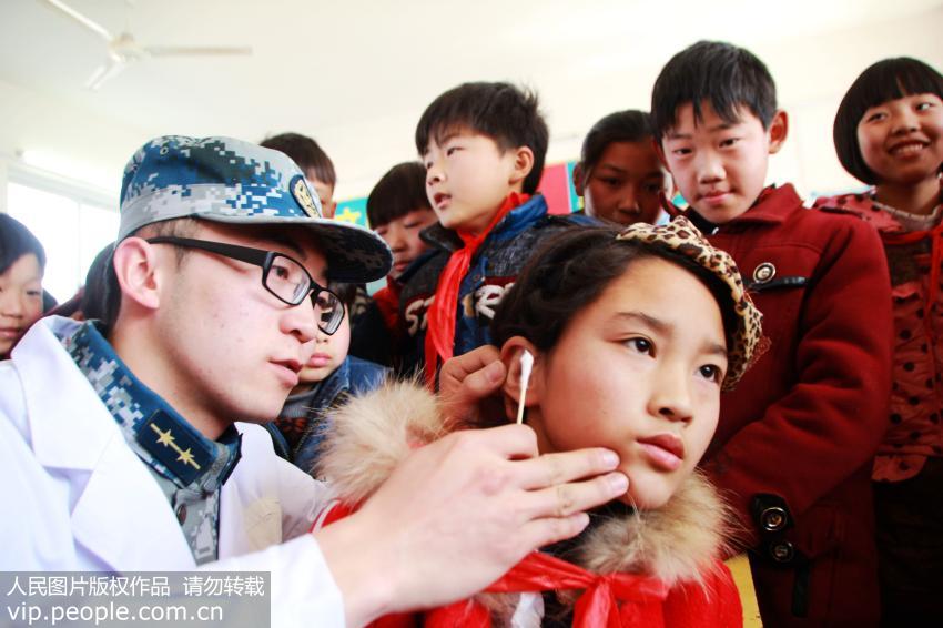 2017年3月1日,空軍駐宛某部的軍醫在指導河南內鄉縣大橋鄉郭河村的學生正確掏耳屎。(張中立/人民圖片)
