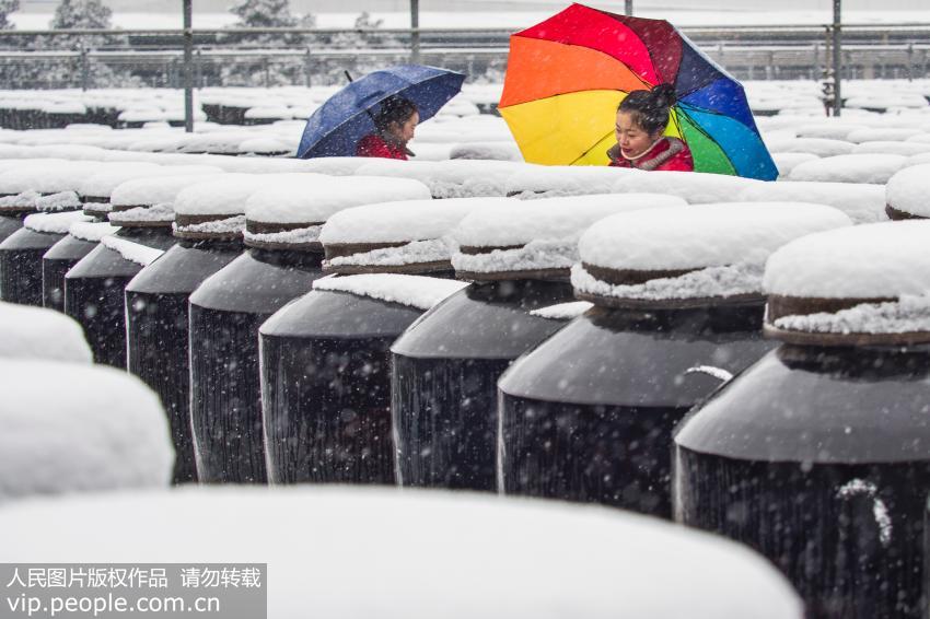 2018年1月25日,酱油厂工作人员在晾晒场巡查酱油醋的酿造封存情况。