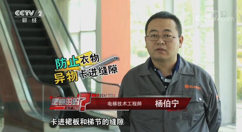 杨伯宁说:“裙板上边也有安全保护装置,如果是梯节跟裙板之间的缝隙卡入异物,在走到两端的过程中会触及到裙板的安全保护装置,裙板的安全保护开关开启后,会断开电梯控制系统的电源,使电梯停止运行。”